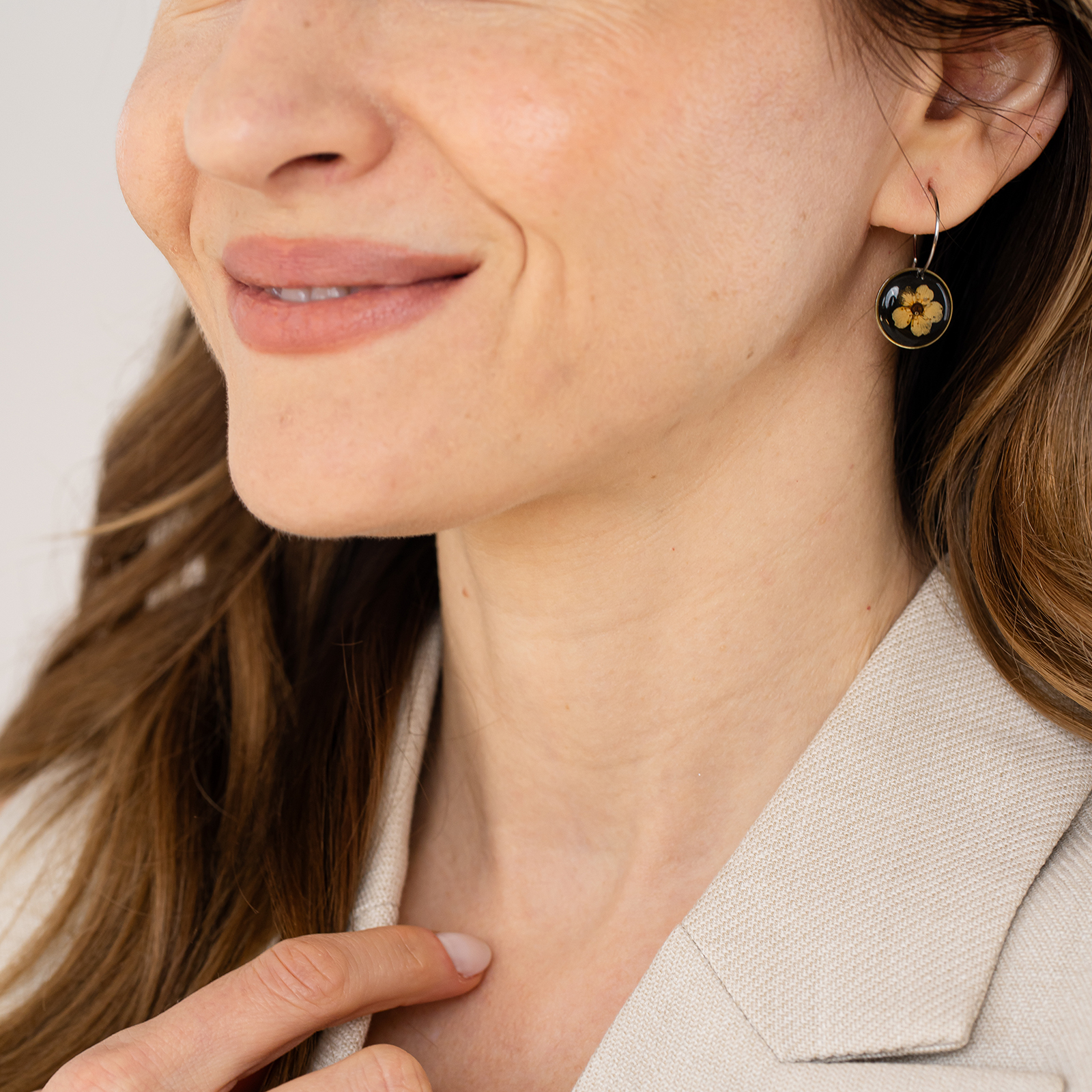 Delicați, rotunzi, cu flori discrete de cuniniță așezate pe un fundal negru curat - cerceii BLOOM sunt despre contrast și echilibru. Micuți, dar expresivi. Ușor de purtat, greu de ignorat. Reflexiile fine le dau viață în lumină, fără să-i facă stridenți.