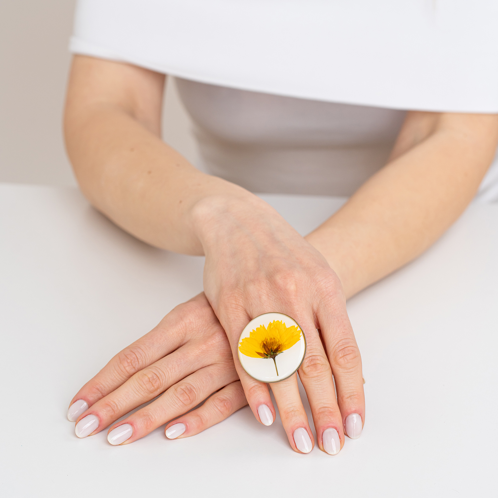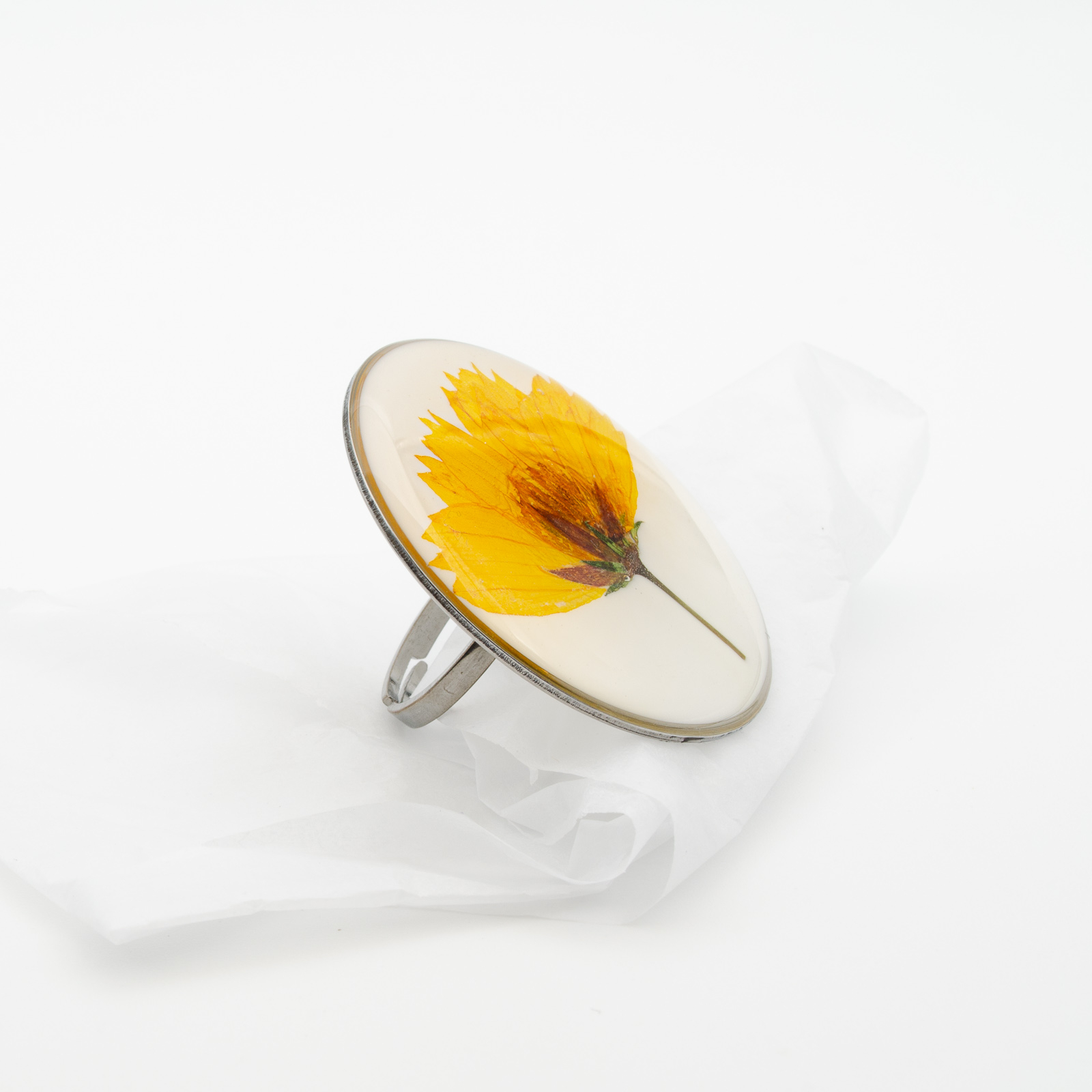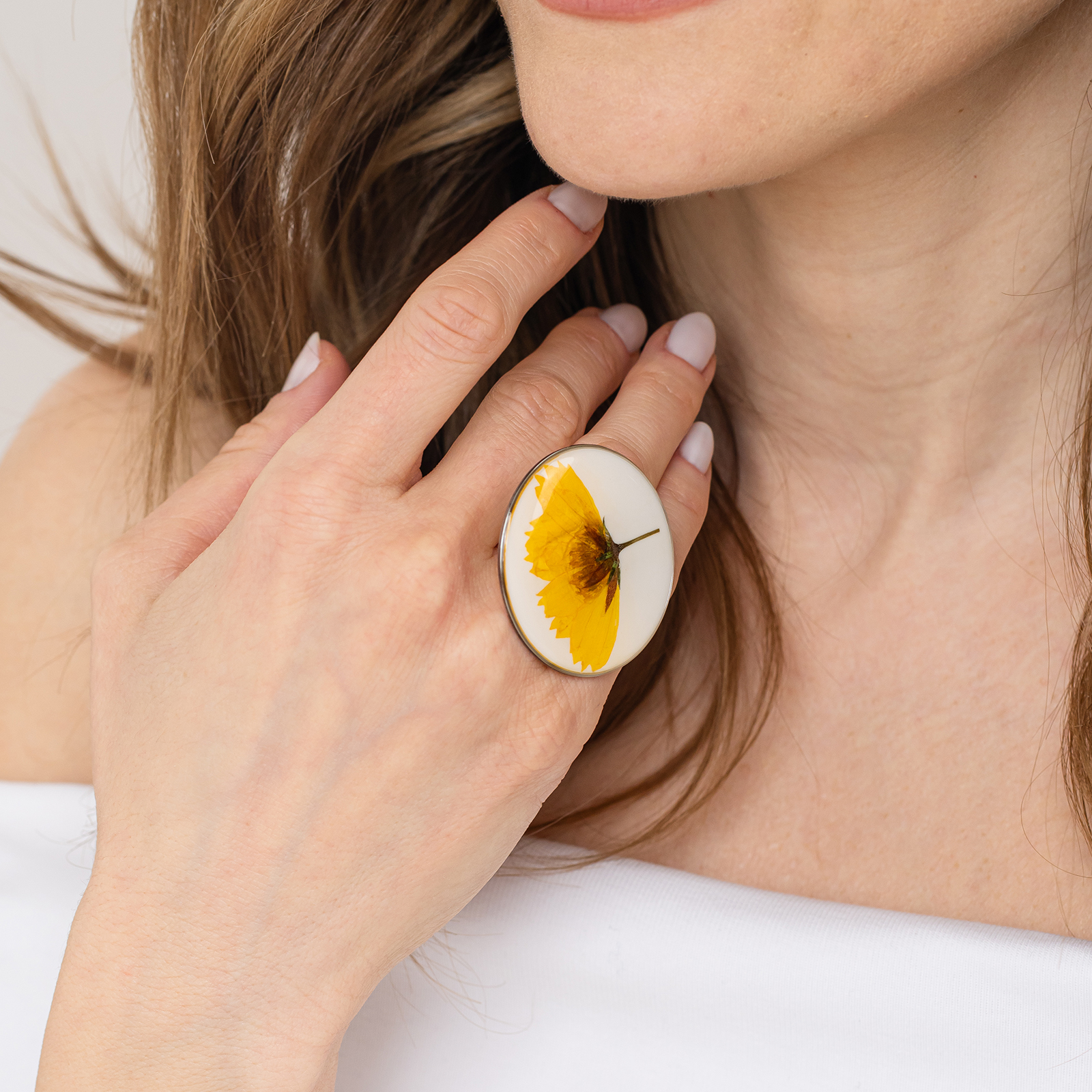 Un soare mic purtat pe deget. O floare galben intens, cu petale ca niște raze, fixată pe un fundal alb curat, într-o compoziție care atrage toate privirile. Forma rotundă și dimensiunea supradimensionată transformă acest inel într-o piesă-centrul-universului. Este pentru zilele în care vrei să luminezi, nu doar să accesorizezi.