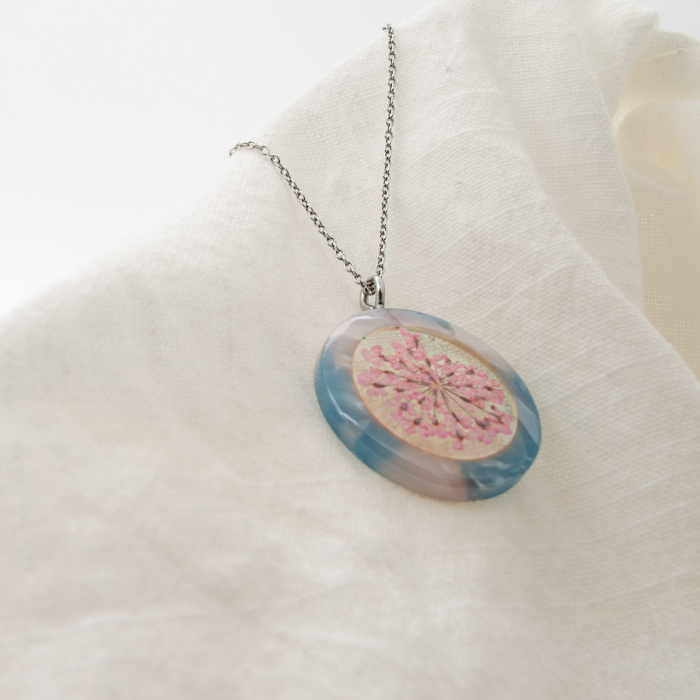 Lucrăm cu elemente fine din oțel inoxidabil și rășini hipoalergenice pentru a obține coliere handmade surprinzător de ușoare, ideale pentru purtare zilnică. Finisajele netede și tehnica atentă de sigilare păstrează florile protejate, astfel încât aceste coliere handmade să rămână strălucitoare și autentice.