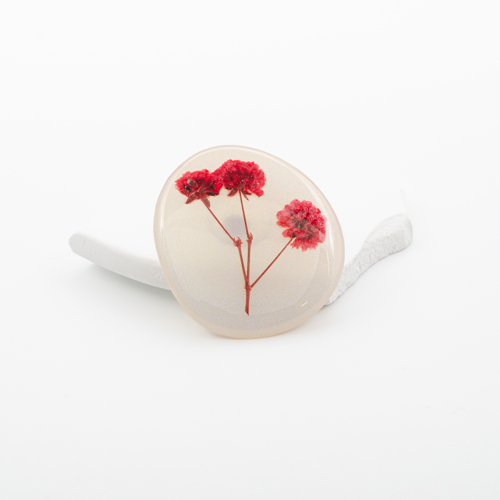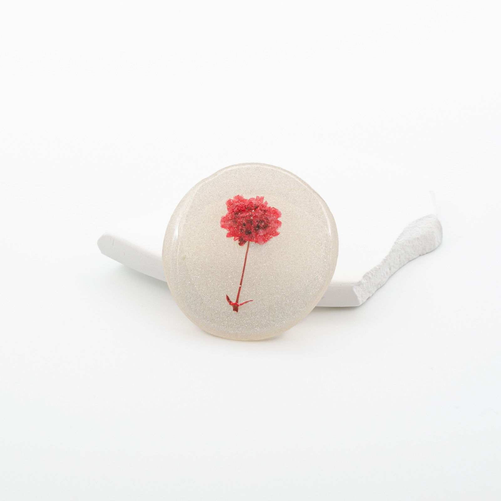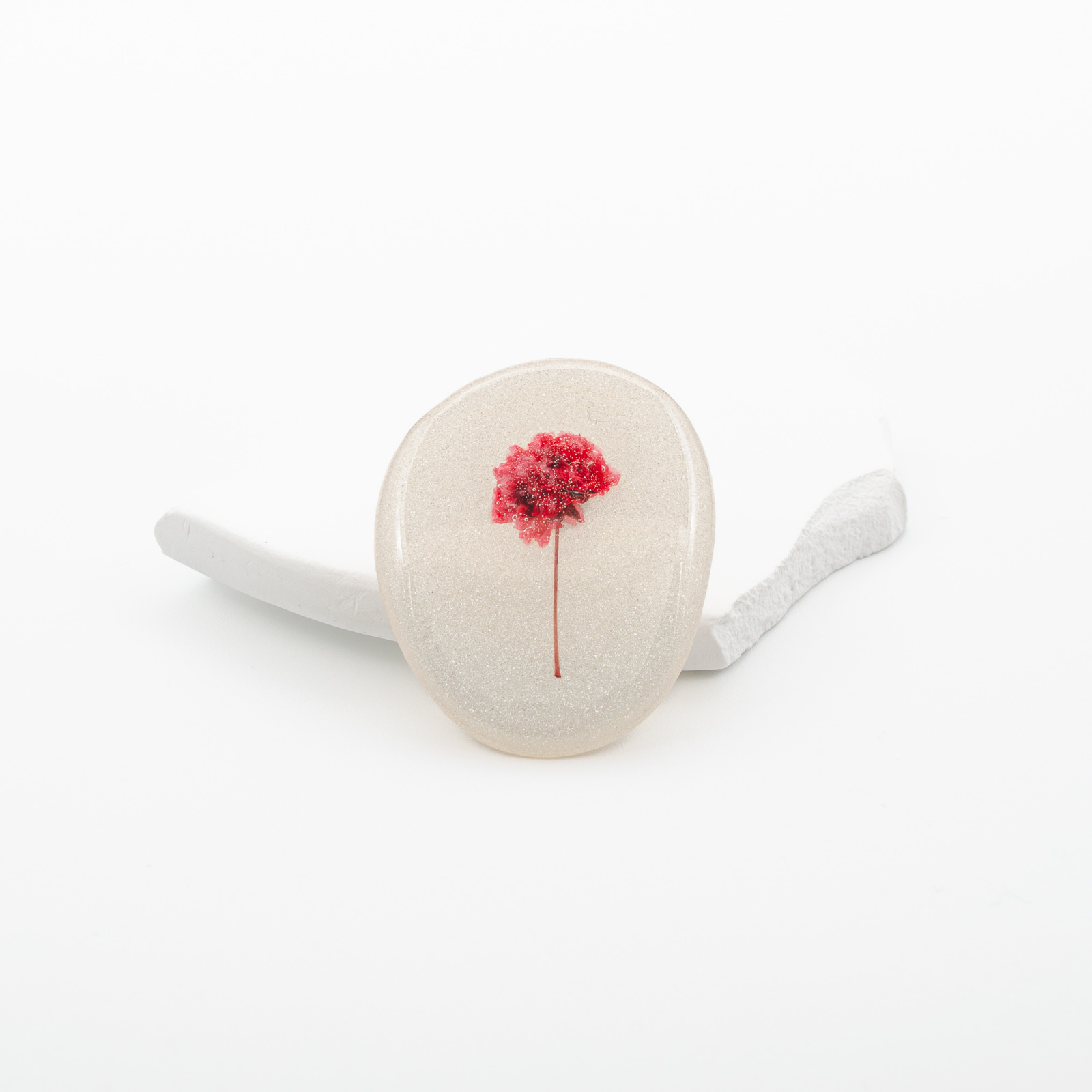 Un detaliu care aduce lumină oricărei ținute - „Essence” păstrează o floare roșie vibrantă, prinsă într-un fundal alb perlat, cu reflexii care amintesc de zăpada scânteietoare în razele soarelui. Forma accentuează naturalețea compoziției și face ca fiecare piesă să fie unică.