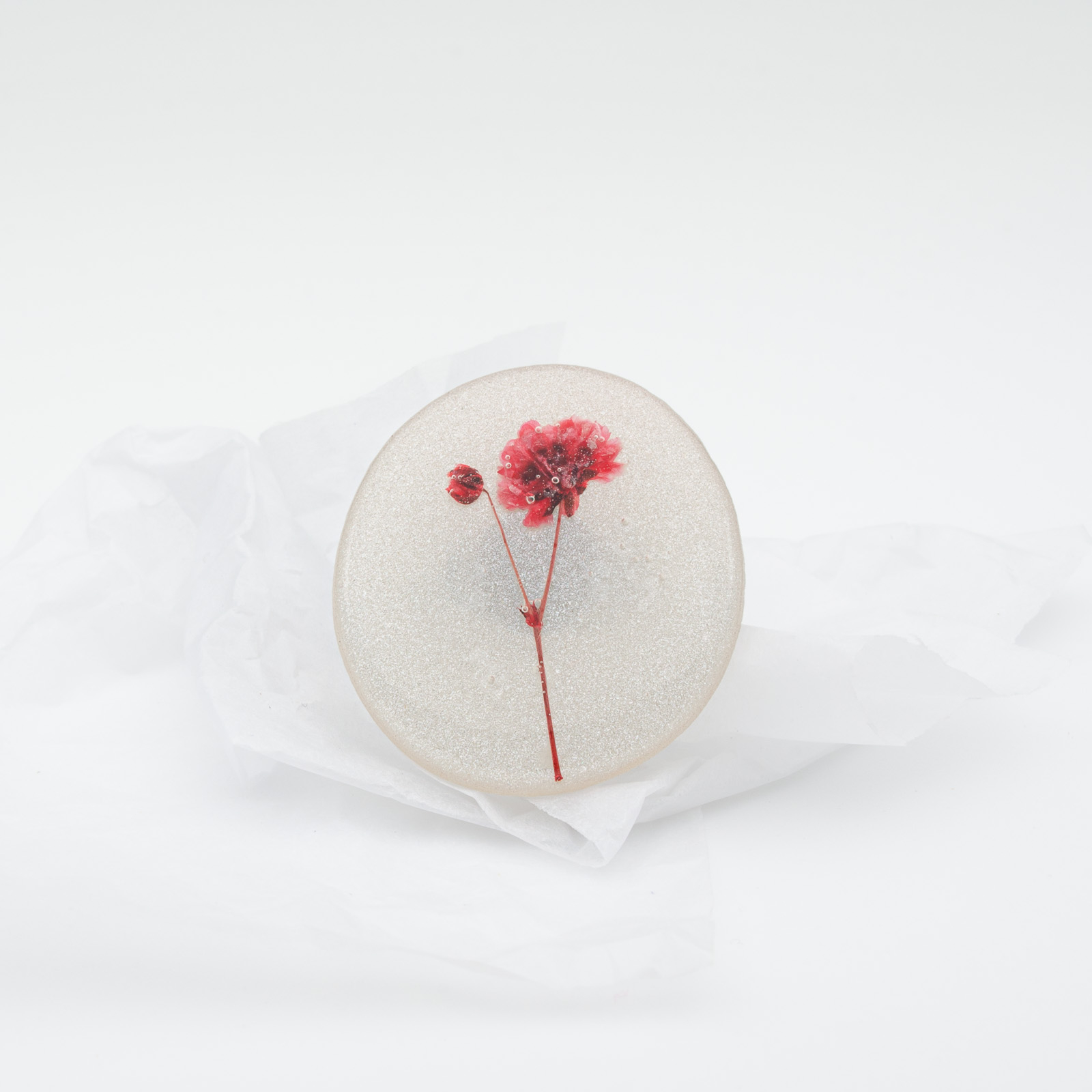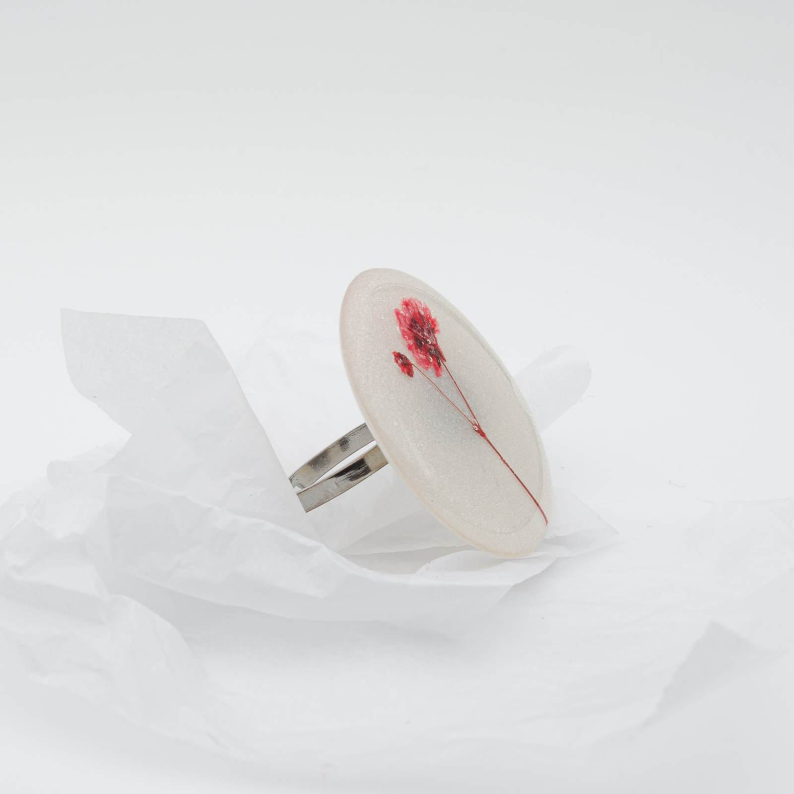 Un inel ca o vrajă: petalele roșii de imortele par înghețate peste un fundal alb perlat cu irizații discrete, ca un strat de zăpadă prins în lumina caldă a dimineții. Contrastul vibrant dintre roșu și alb, între natură și fantezie, face din „Magic” o piesă cu adevărat de basm.