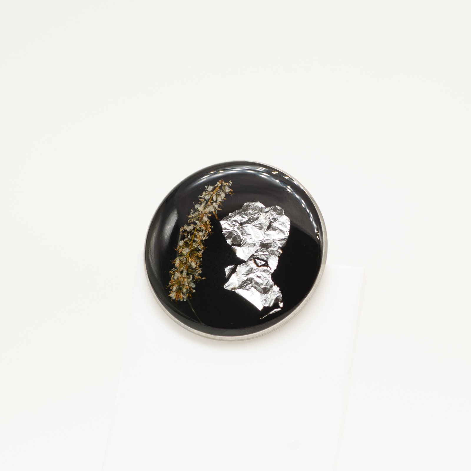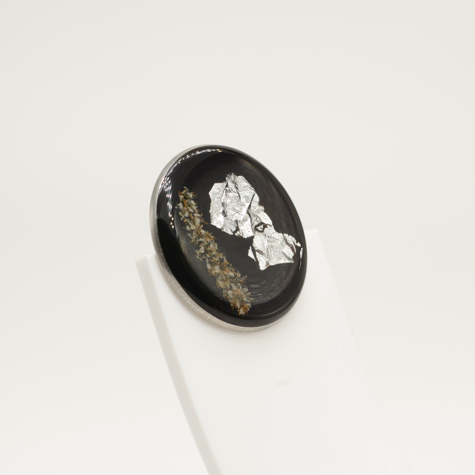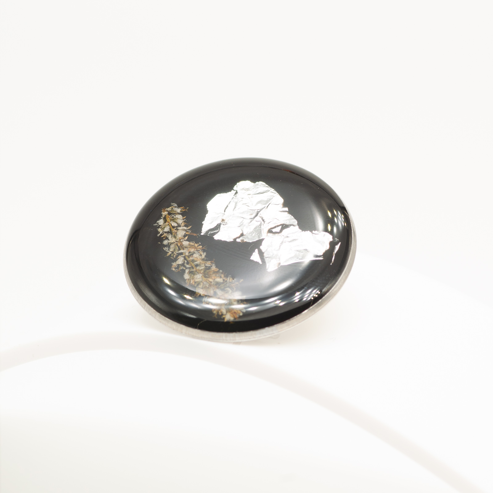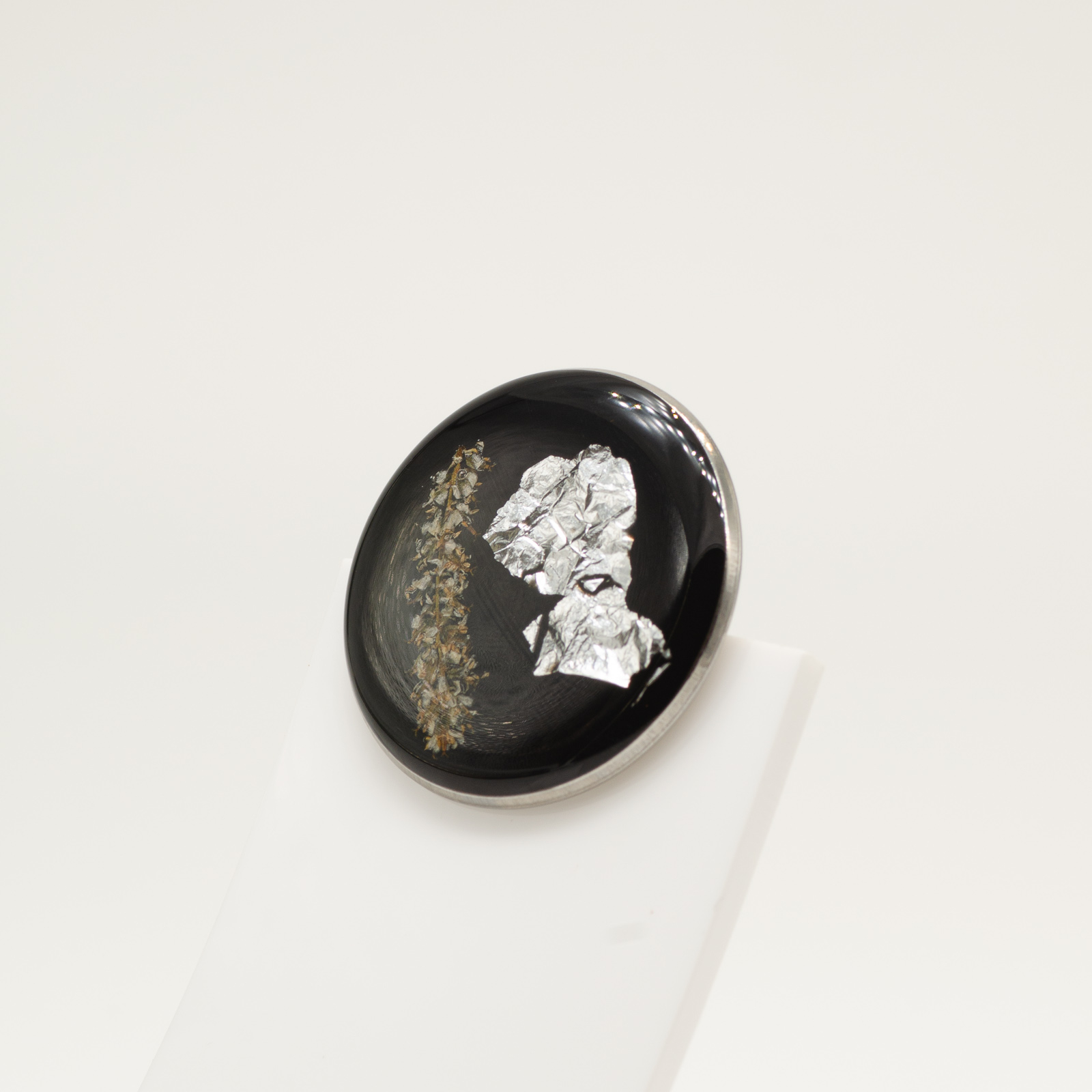 Plante/flori naturale + rășină (pentru conservare și protecție) + sistem de prindere tip broșă/pin (metal). Dacă ai o pagină „Materiale / Îngrijire”, poți linka acolo pentru detalii tehnice.