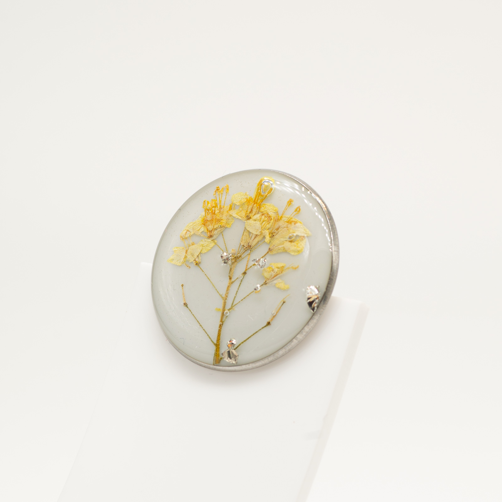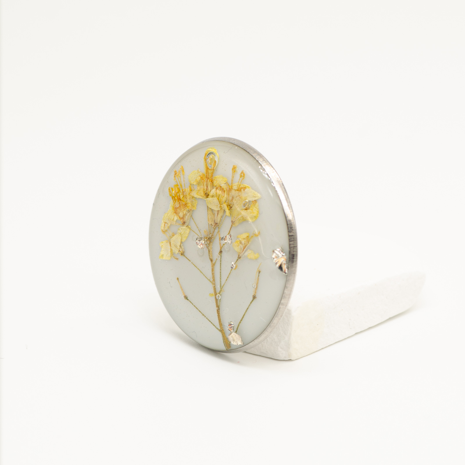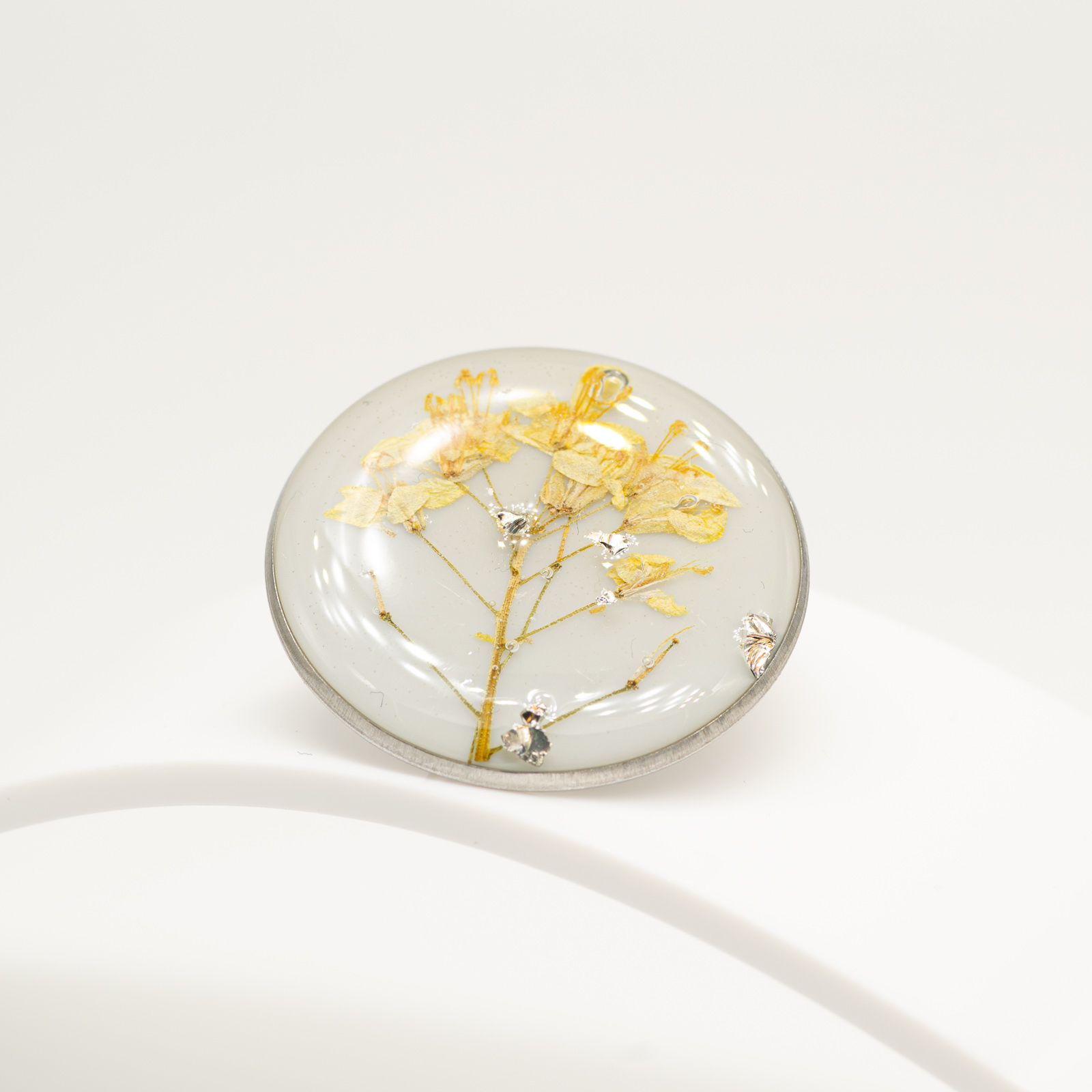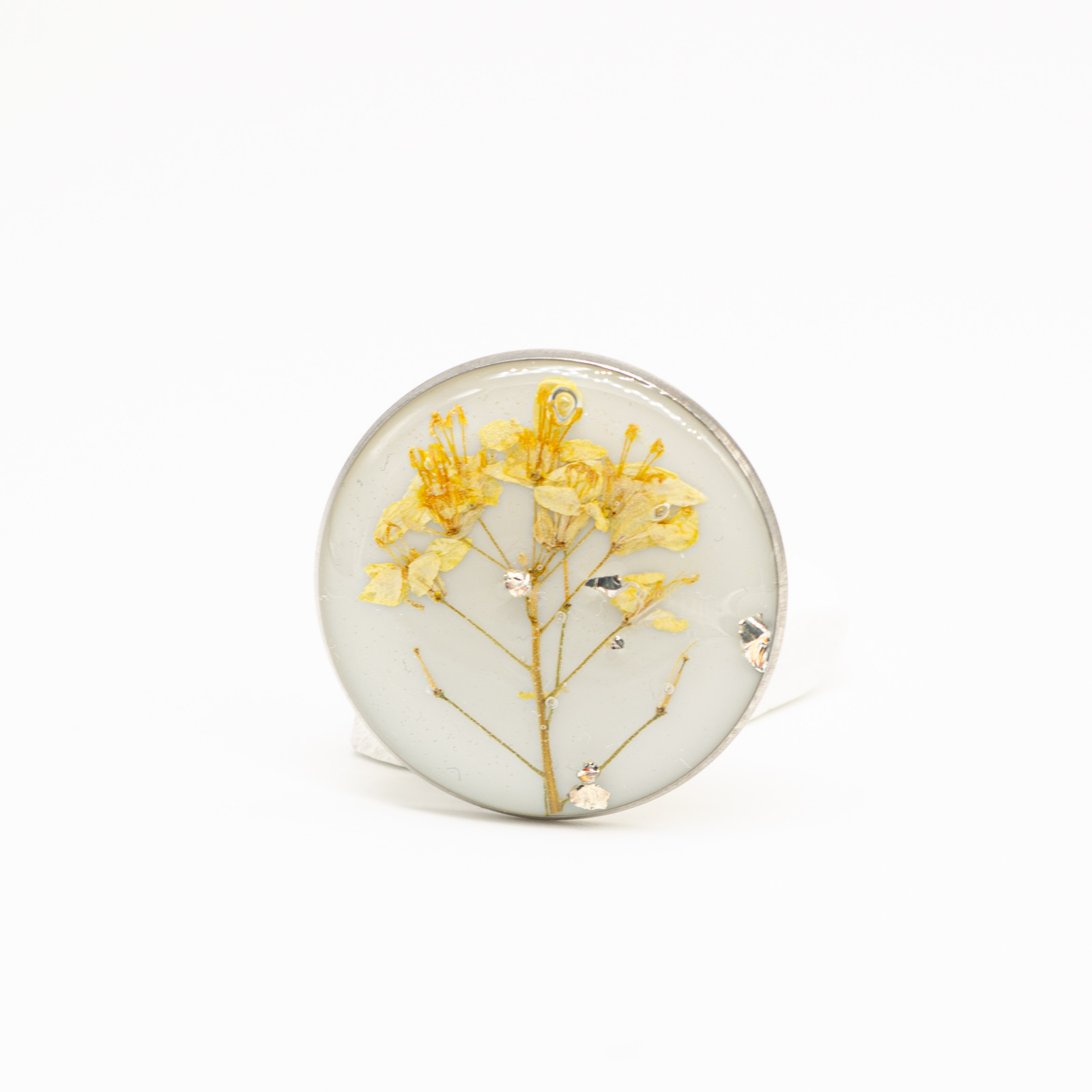 O floare de câmp galbenă, păstrată într-o compoziție echilibrată, pe un fundal alb-gri temperat. Incluziunile discrete de sticlă argintie adaugă profunzime și lumină, fără să iasă în față. Totul rămâne curat, controlat, bine dozat.