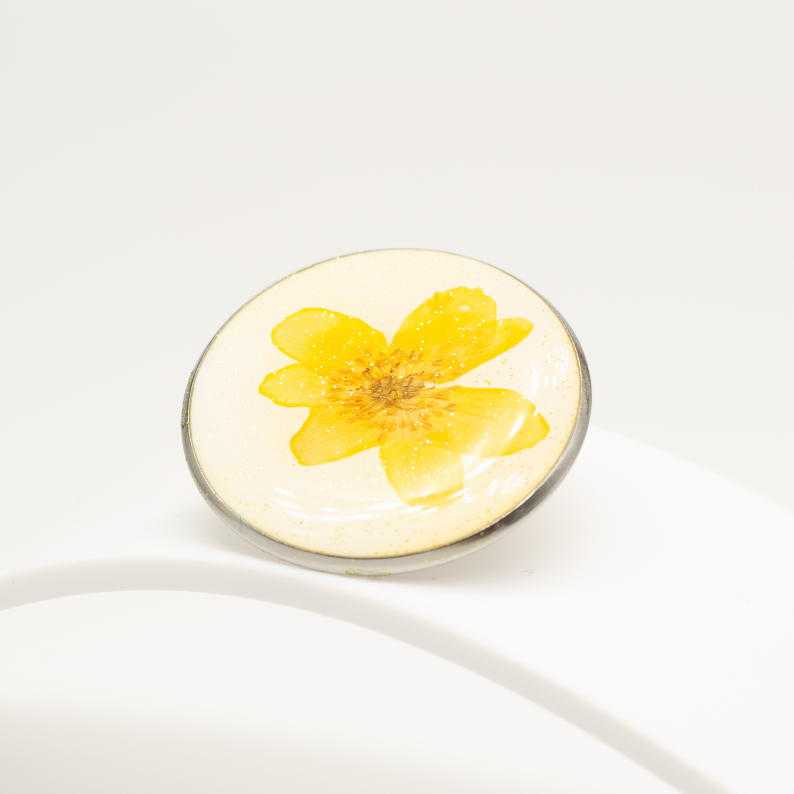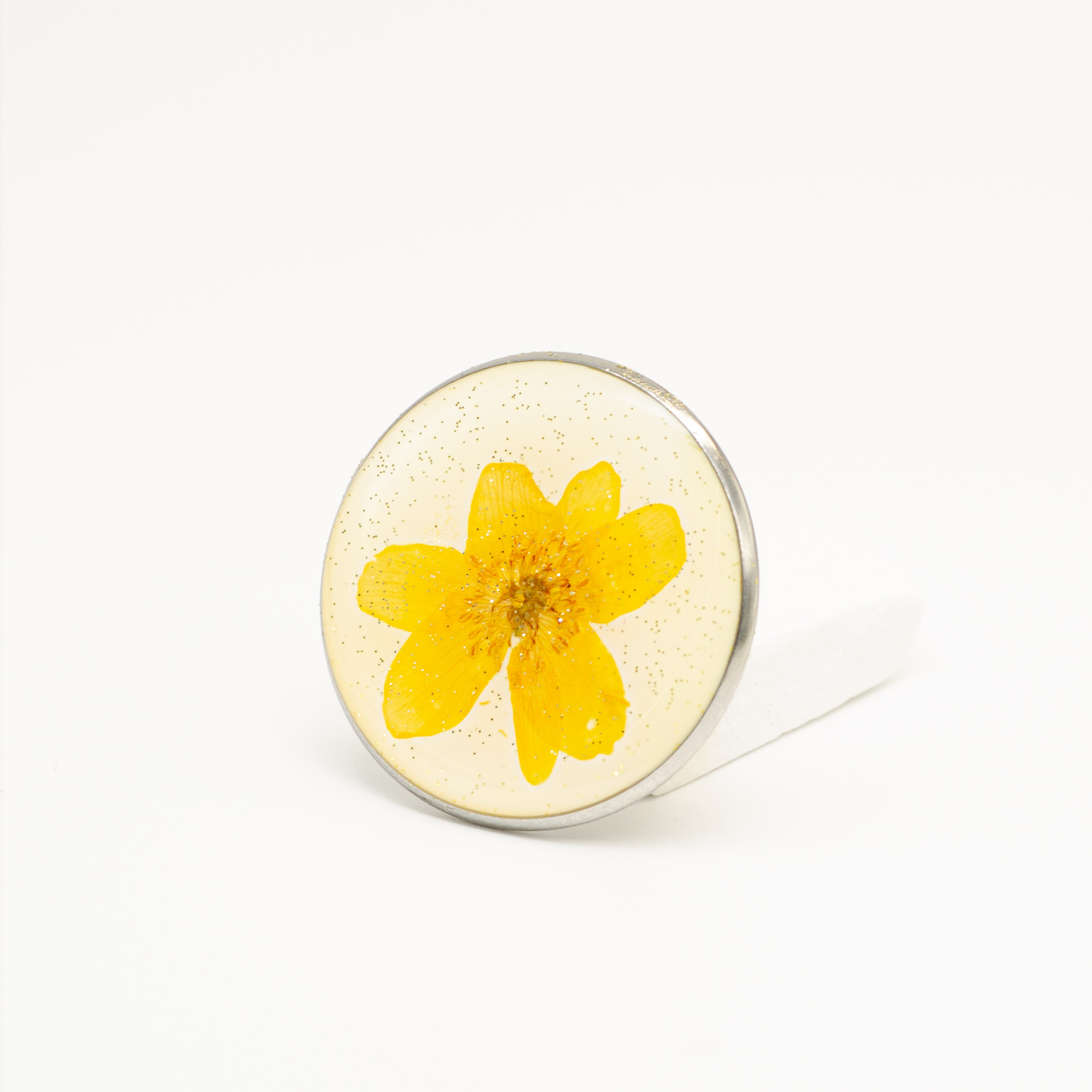 O floare galbenă naturală, deschisă, prinsă într-o compoziție rotundă, pe fundal deschis, cu particule fine de glitter auriu. Luminos, echilibrat, cu un accent cald care prinde bine în lumină. Un obiect mic, dar vizibil, care aduce energie fără să fie în exces.