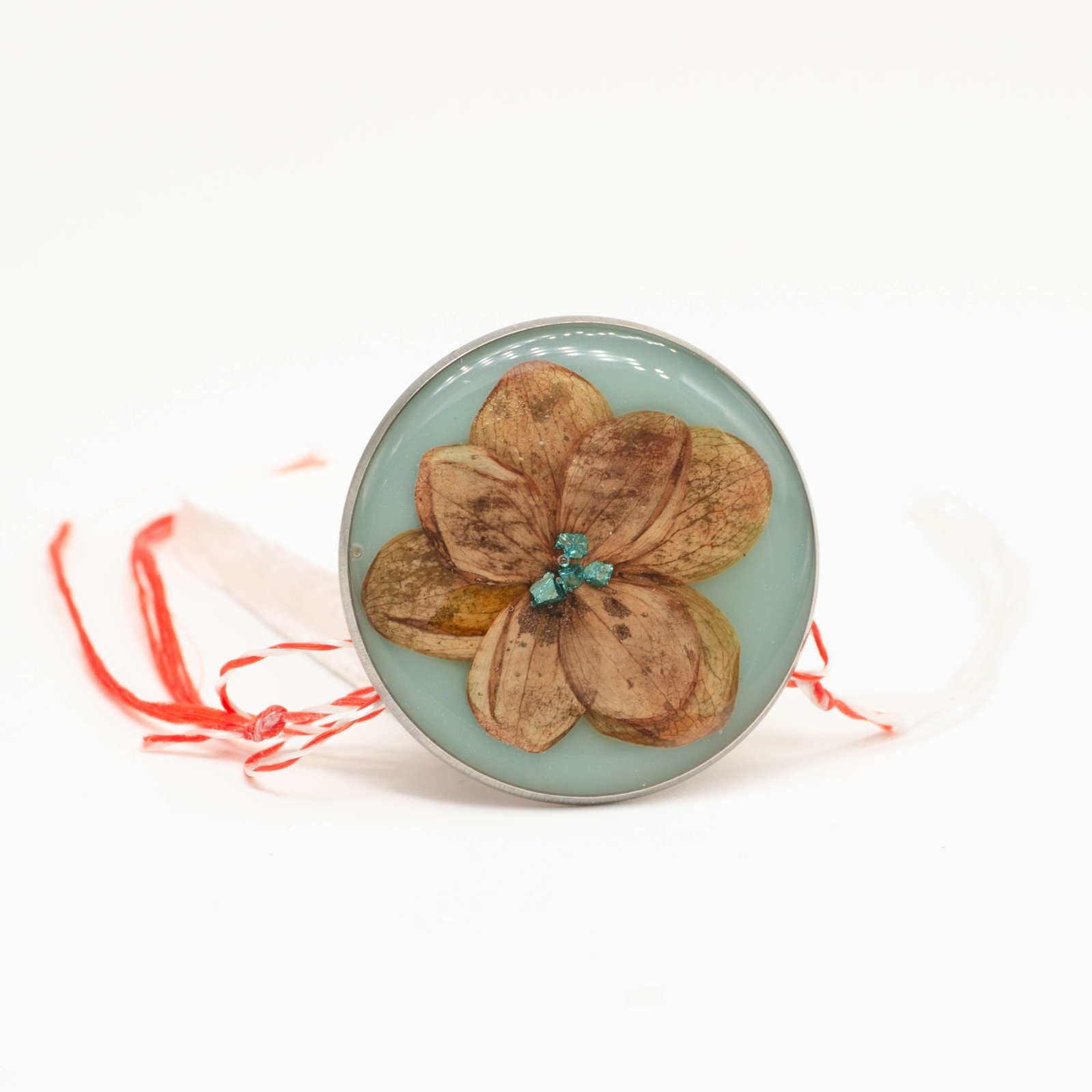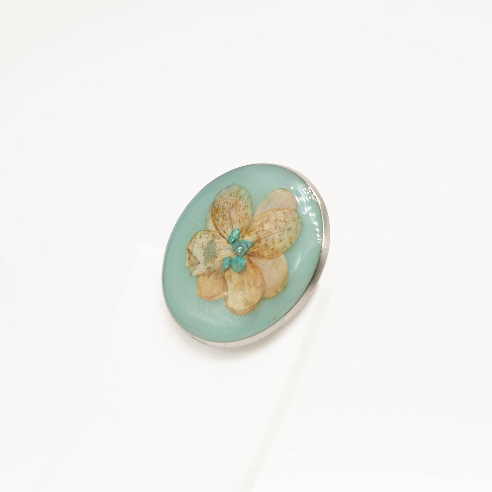 • Materiale: floare naturală, rășină specială pentru bijuterii, oțel inoxidabil