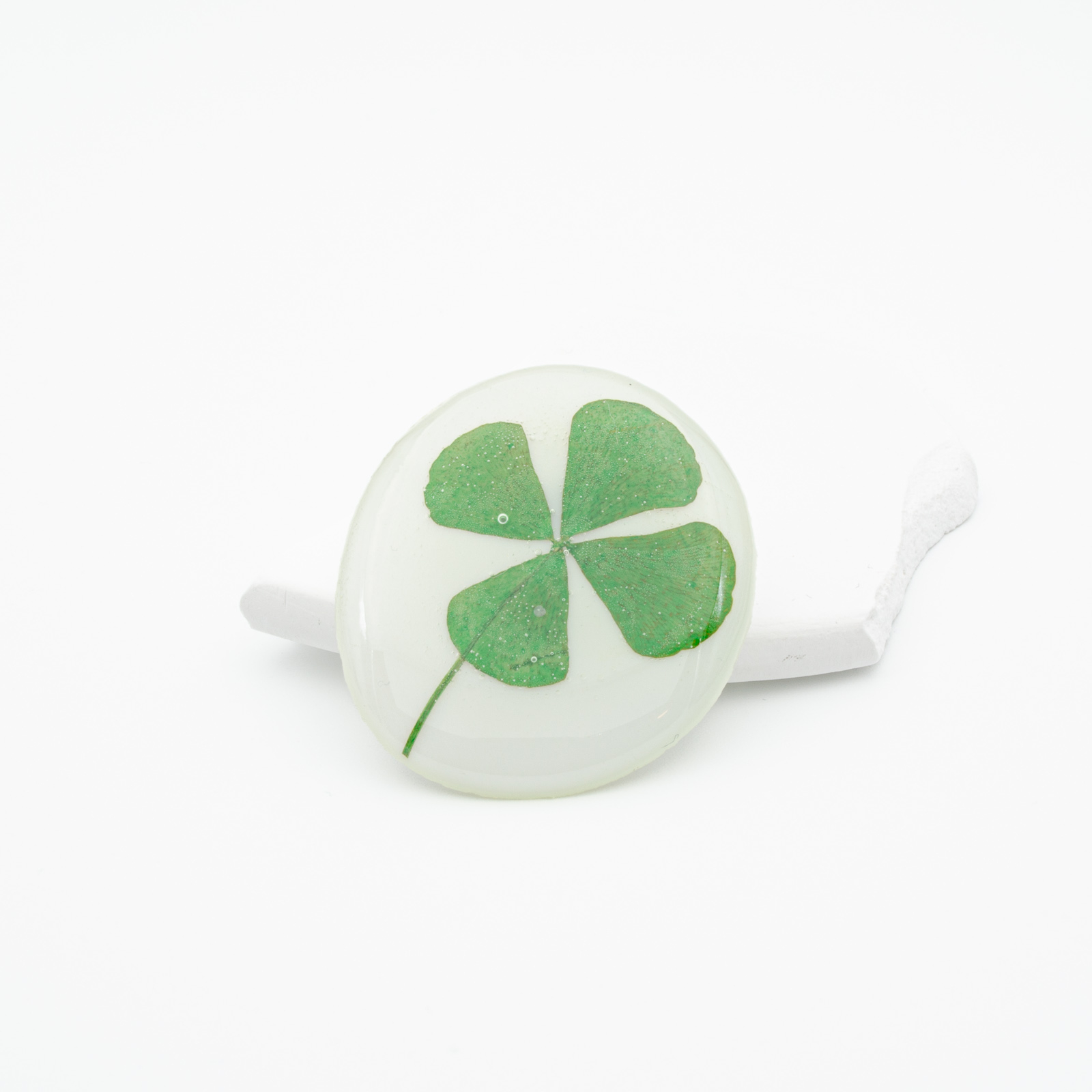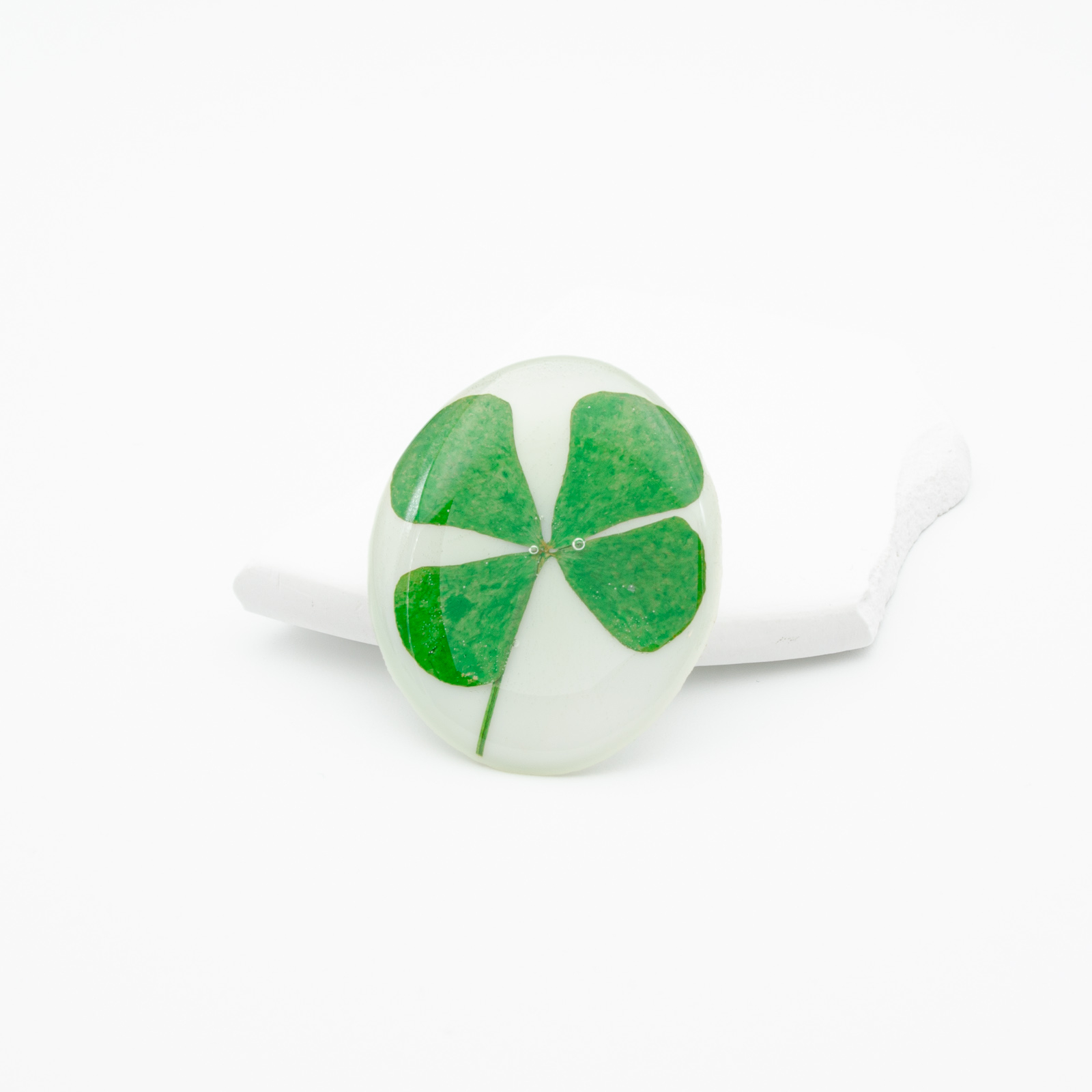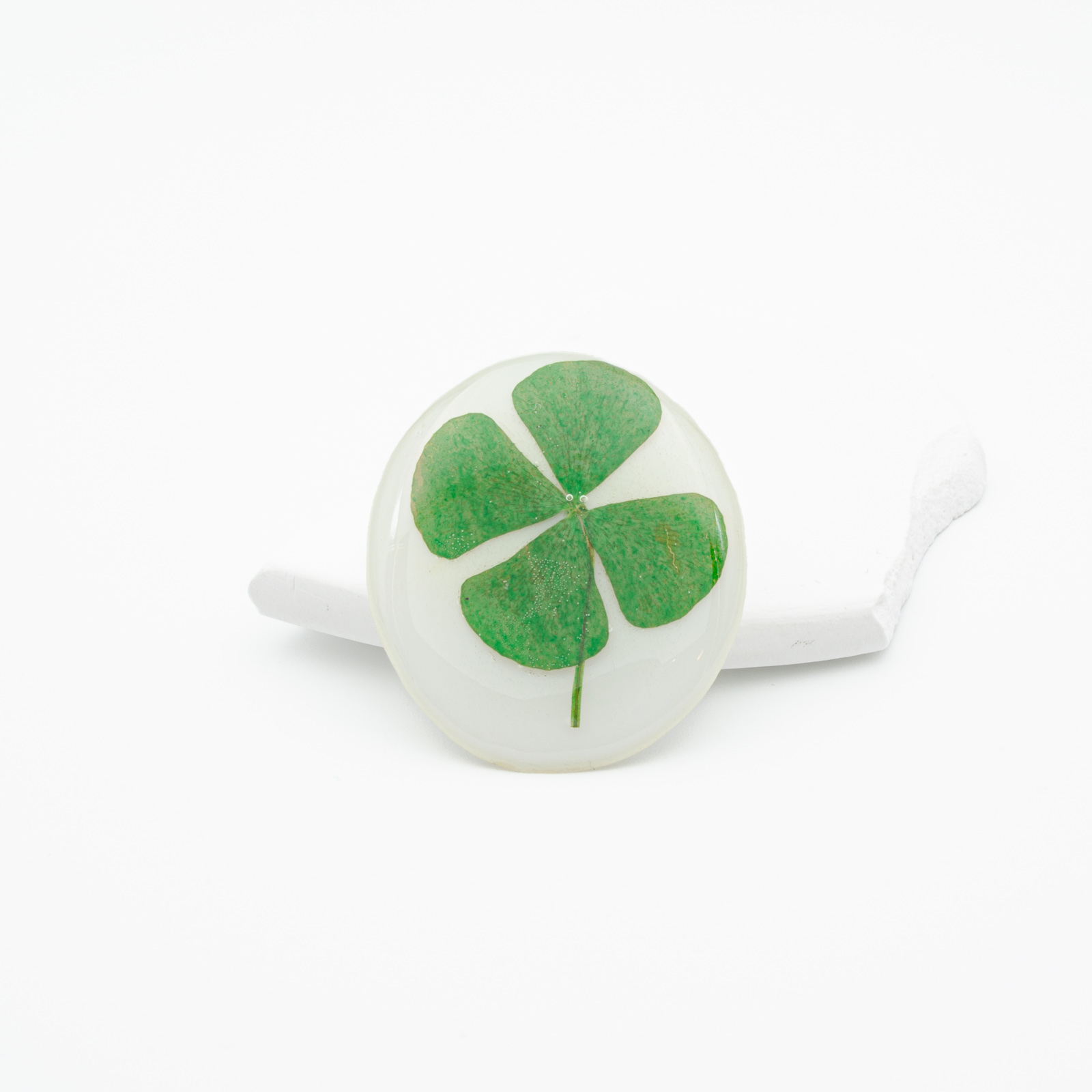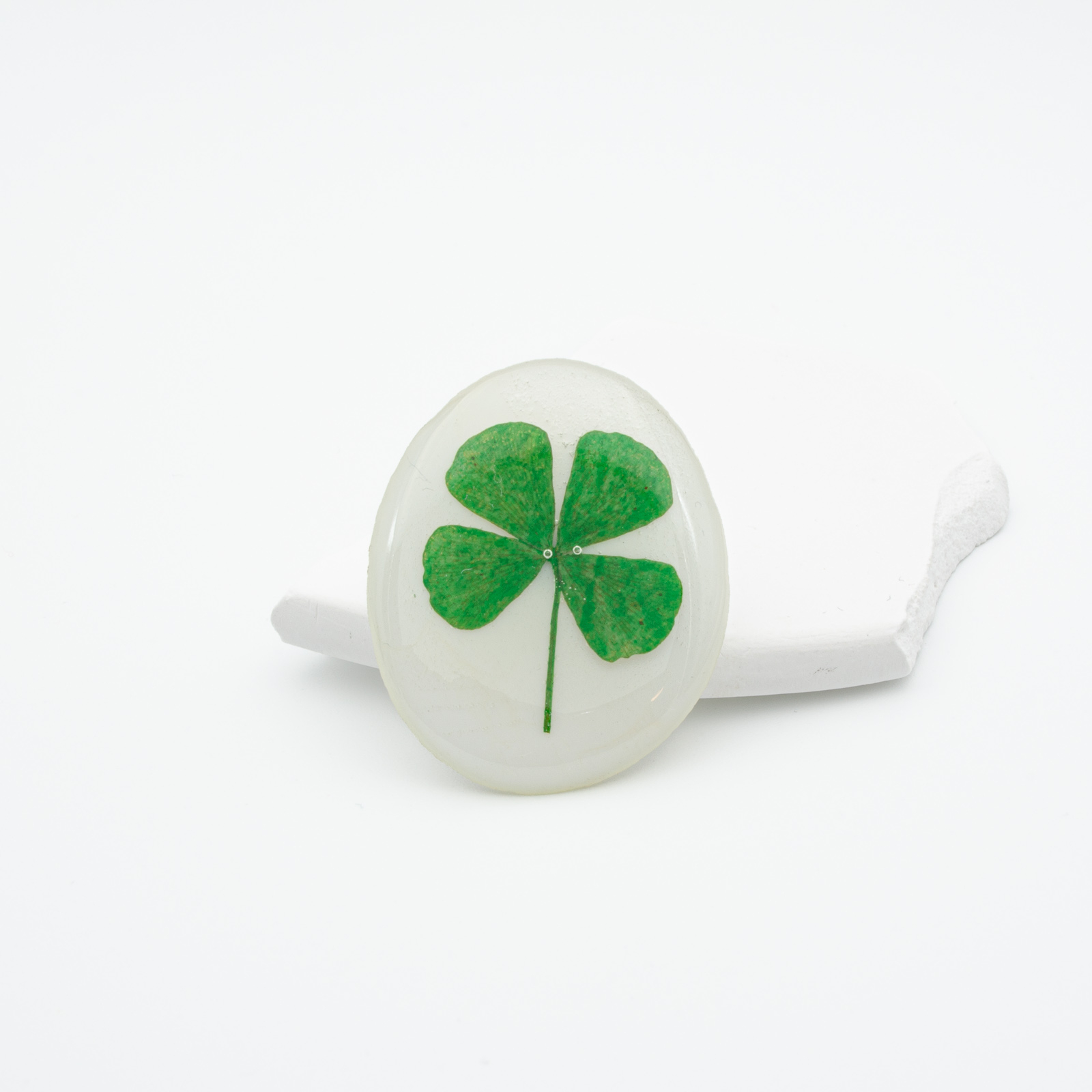 „Noroc” este o broșă-talisman cu un trifoi cu patru foi natural, așezat pe un fundal alb imaculat care îi scoate în evidență forma pură și nuanțele intense de verde. Compoziția minimalistă accentuează simbolistica acestei plante rare, purtătoare de șansă și protecție.